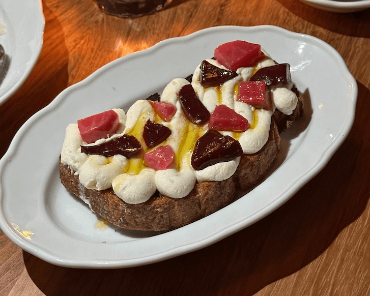The whipped ricotta and beet sott’olio bruschetta ($15) was an early standout—creamy sheep ricotta against crispy, charcoal-grilled sourdough, topped with tangy preserved beets. The borlotti bean and black kale ($23) was comforting, to say the least, with the smokiness of the farro verde complementing the savoury grilled pancetta. Nor can I forget the mellow sweetness of the charred leek and cipollini onion ($19) that melted in my mouth.