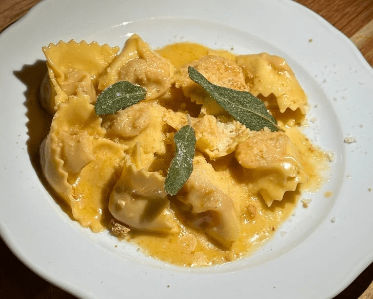 These delicate hat-shaped pasta are filled with roasted pumpkin, coated in a brown butter and lemon sauce and garnished with crushed amaretti cookies and fried sage—looks like summer, but tastes like fall. The pumpkin filling is nutty, smooth and subtly sweet, paired perfectly with a rich, zesty sauce. Each bite was like a warm hug and pocket of sunshine.