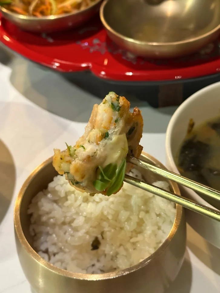 The rolled omelette (gyeran-mari) was delicately fluffy, the stir-fried zucchini (hobak bokkeum) was nutty and subtly sweet. Even the lotus root pancake (yeon-geun jeon), which I’ve never been a fan of, won me over: thin, crunchy lotus root slices sandwiching a plump shrimp, coated in flour and egg, pan-fried golden and topped with a zesty yuzu (yuja) mayonnaise.